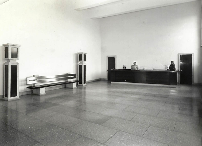 Sobrios nichos de mármol con chapetones en bronce dentro de un elegante y majestuoso edificio estilo europeo.